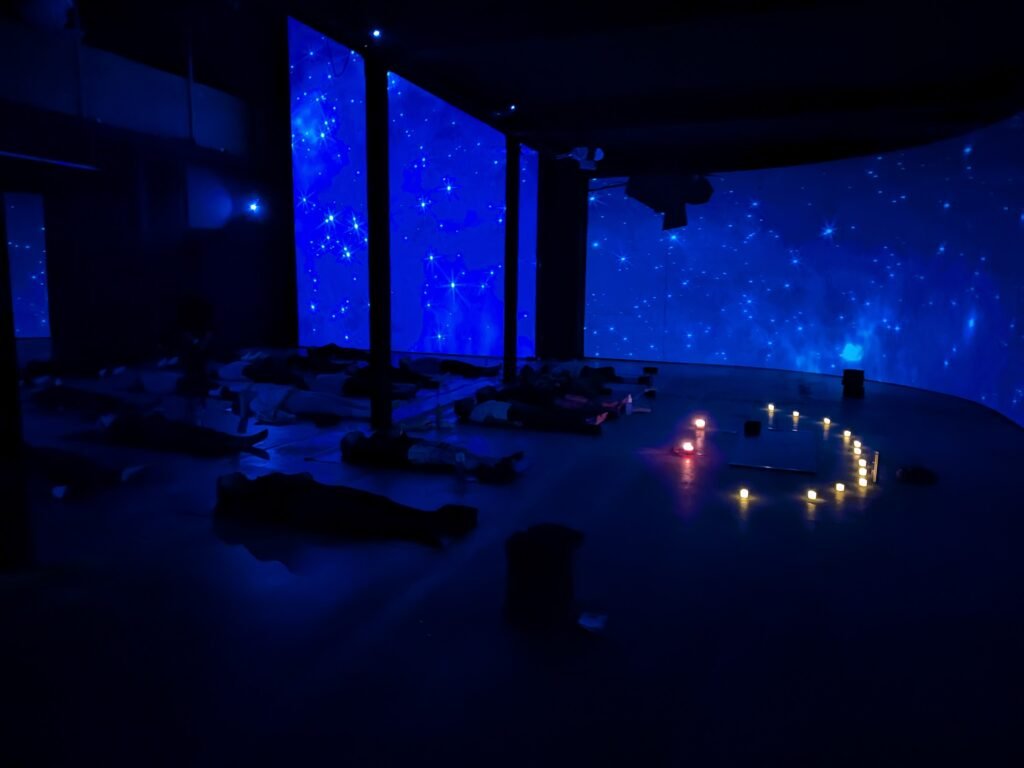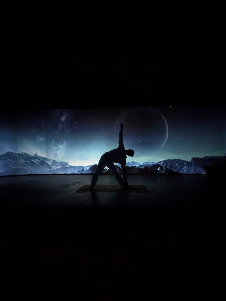 Located inside the art gallery Vincent Hall, Cosmic Wave Yoga is a 360° immersive environment where visual landscapes surround the practice. Each session becomes a journey, guiding you through different atmospheres while remaining grounded in the body and breath.
